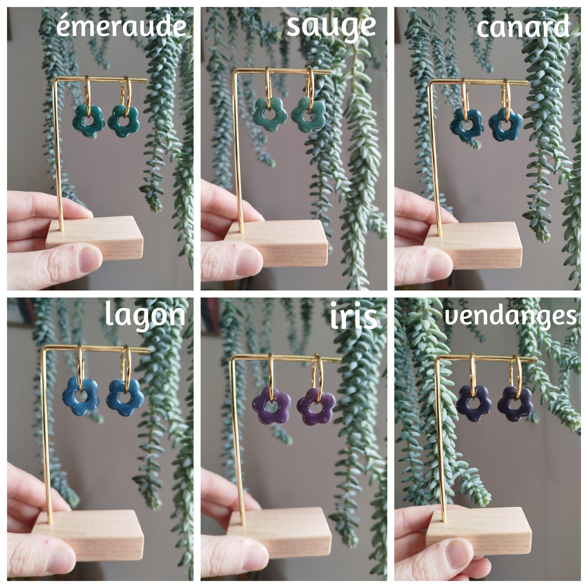 Possibilité de choisir l'attache : clou d'oreille ou enfilée sur une créole. Dans ce cas, il est possible d'acheter les créoles à part (pour ne pas avoir à les acheter pour chaque paire !